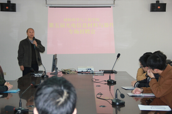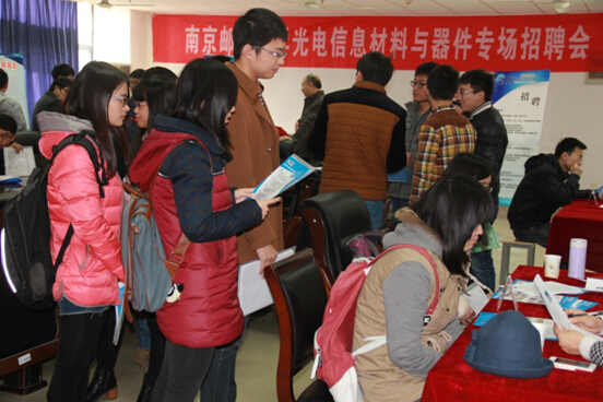 2014年12月22日上午,开云体育app下载 在教5-413成功举办第五届开云体育app下载 “光电信息材料与器件”专场招聘会。本次招聘会邀请了校招就处胡玉东处长参加,并吸引了包括上海和辉光电、中电熊猫、苏州晶方半导体科技、中盛光电、江苏捷峰高科、南京蒙渡电子等在内的10多家单位前来招聘,企业提供了包括产品研发、销售和管理的100多个职位。