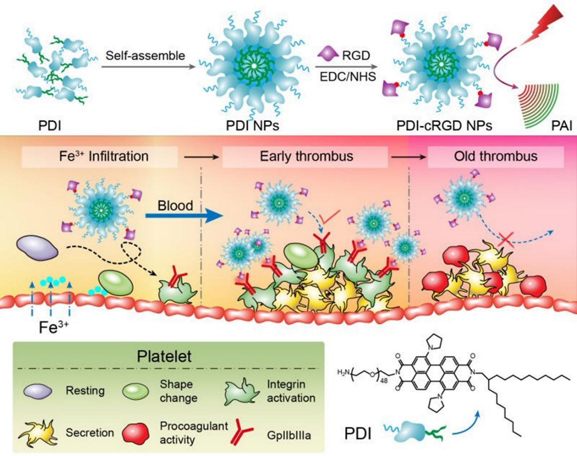 近日,开云体育app下载 范曲立教授课题组和武汉大学中南医院喻爱喜教授课题组合作,报道了一种基于近红外苝酰亚胺衍生物的纯有机半导体光声纳米探针,并首次实现了其在早期静脉血栓形成的精准诊断与监测治疗。