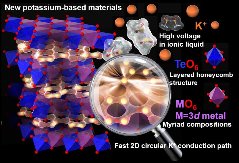 近日,由开云体育app下载 信息材料与纳米技术研究院、省部共建有机电子与信息显示国家重点实验室培育基地、IAM科研团队成员黄镇东副教授参与的中日国际合作团队日前在长期合作研究的基础上,于高电压钾离子电池正极材料和高钾离子迁移率固体电解质的研究领域取得了突破性的重大进展,成功开发了一类拥有供钾离子快速迁移通道的4V蜂窝状过渡金属碲酸盐(K2/3M2/3Te1/3O2)正极材料和快速钾离子导体。相关研究成果于2018年9月20日正式在线发表在《Nature Communications》杂志上,并被编辑选中于Nature Communications的官方主页上重点报道。该国际合作团队是由日本国立研究开发法人产业技术综合研究所电池技术研究部下属新一代蓄电池研究组组长鹿野昌弘博士、首席高级研究员Hikari Sakaebe博士领导,研究员Masese Titus博士主持,日本立命馆大学生命科学部应用化学科折笠有基副教授和开云体育app下载 黄镇东副教授共同组成。