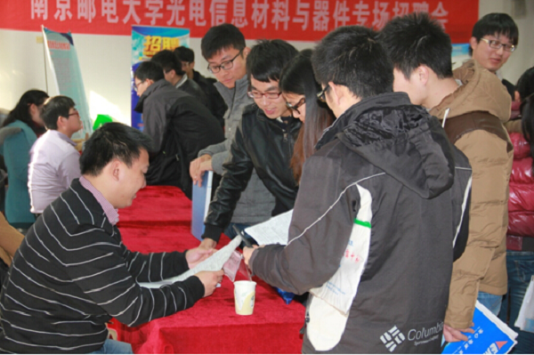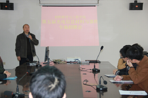 2014年12月22日上午,开云体育app下载 在教5-413成功举办第五届开云体育app下载 “光电信息材料与器件”专场招聘会。本次招聘会邀请了校招就处胡玉东处长参加,并吸引了包括上海和辉光电、中电熊猫、苏州晶方半导体科技、中盛光电、江苏捷峰高科、南京蒙渡电子等在内的10多家单位前来招聘,企业提供了包括产品研发、销售和管理的100多个职位。