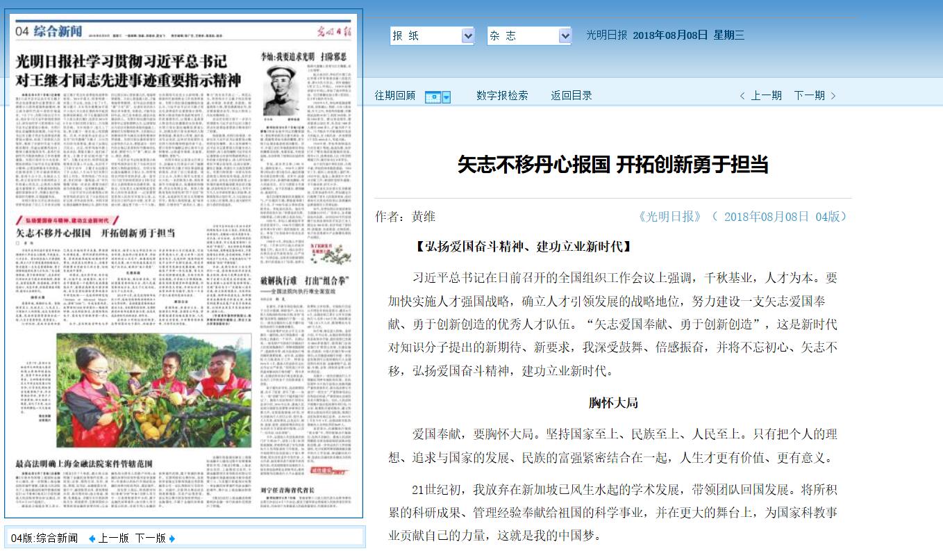 习近平总书记在日前召开的全国组织工作会议上强调,千秋基业,人才为本。要加快实施人才强国战略,确立人才引领发展的战略地位,努力建设一支矢志爱国奉献、勇于创新创造的优秀人才队伍。“矢志爱国奉献、勇于创新创造”,这是新时代对知识分子提出的新期待、新要求,我深受鼓舞、倍感振奋,并将不忘初心、矢志不移,弘扬爱国奋斗精神,建功立业新时代。