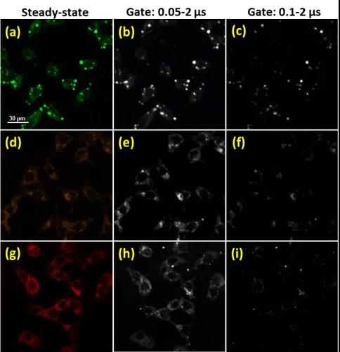 经过方法优化,可形成粒径在90-300 nm范围内的粒子,在这些粒子表面附着的穿膜肽作用下,这些粒子可以较好分散在水溶液中,并可以较快进入细胞。荧光共聚焦成像和流式细胞术结果表明,经过5分钟孵育就可以检测到细胞内有这些粒子的荧光信号,充分说明了穿膜肽可介导非共价连接的粒子进行跨膜转运。此外,由于疏水分子聚集在粒子内部,可以有效抑制氧分子的扩散和分子的非辐射热弛豫,因而这些粒子在室温有氧条件下也具有长寿命的延迟荧光,粒子在有氧条件下的寿命在微秒级以上,通过几十到数百纳秒的延迟,这些长寿命发光信号可以与散射光、短寿命自荧光区分开来(图2)。时间分辨荧光成像结果表明,经过1小时的孵育后,可以显著检测到细胞内的长寿命荧光信号(图3)。