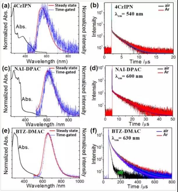 图2、纳米粒子分散液的吸收、稳态和延迟的荧光光谱(a、c、e),及发光随时间的衰减变化 (b、d、f)。[4CzIPN] = [NAI-DPAC] = [BTZ-DMAC] =12.5 μg/mL。