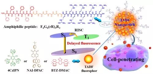 图1、两亲性穿膜肽与延迟荧光分子组装形成纳米粒子