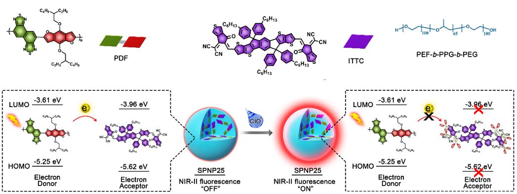 如图1,在此项研究中,团队研究人员采用选择生物标志物-惰性的NIR-II荧光半导体聚合物PDF作为电子供体(D),同时选择生物标志物敏感的有机小分子(ITTC)作为电子受体(A)。利用两亲聚合物PEF-B-PPG-B-PEG包封PDF和ITTC以形成纳米探针(SPNP25)。在非靶点组织,狭窄的纳米粒子内PDF的NIR-II荧光通过分子间D-A相互作用淬灭,实现在非靶组织的荧光沉默。SPNP25到达靶点组织,该团队人员发现,生物标志物次氯酸钠特异性的降解ITTC,有效的擦除了其受电子能力,有效的破除了D-A相互作用(图2)。从而使PDF的NIR-II荧光恢复。