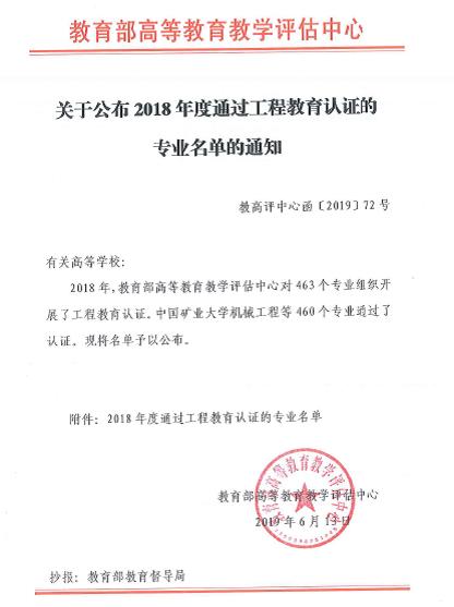 近日,教育部高等教育教学评估中心和中国工程教育专业认证协会分别发布《关于公布2018年度通过工程教育认证的专业名单的通知》(教高评中心函[2019]72号)和《关于公布北京工业大学机械工程等460个专业认证结论的通知》(工认协[2019]29号),对2018年经过开云体育app下载 自评、专业类认证委员会审核,专家组现场考查、结论审议等程序后正式通过工程教育认证的460个专业的认证结论予以公布,开云体育app下载 高分子材料与工程专业顺利通过认证,并获6年有效期,是全国25个通过工程教育专业认证的高分子材料与工程专业之一。