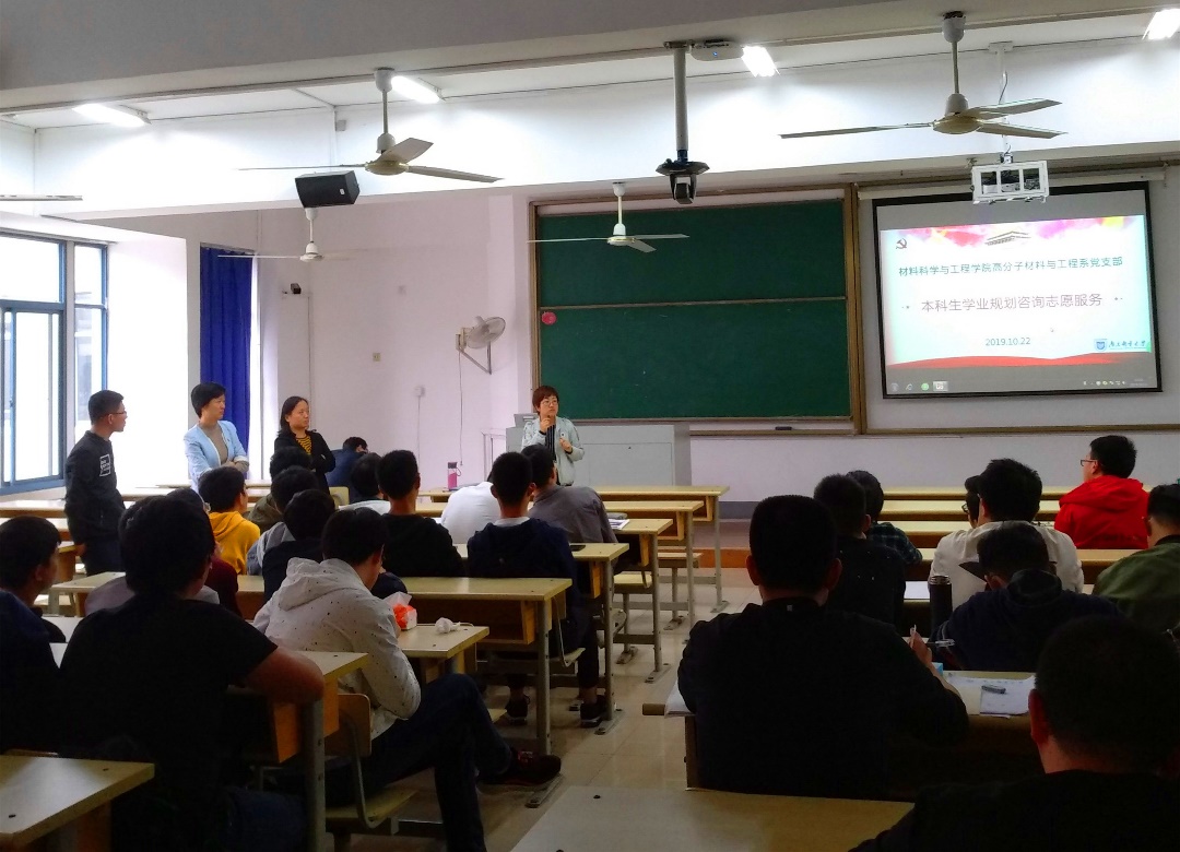 为深入推进“不忘初心、牢记使命”主题教育,激励全体党员同志把主题教育的成果转化为促进各项工作发展的实际成效,高分子材料与工程系教师支部、材料物理支部在10月22日下午开展了学业规划咨询志愿服务,与高分子材料与工程专业本科二年级学生就学业学习、未来发展和人生规划等方面展开交流和指导。