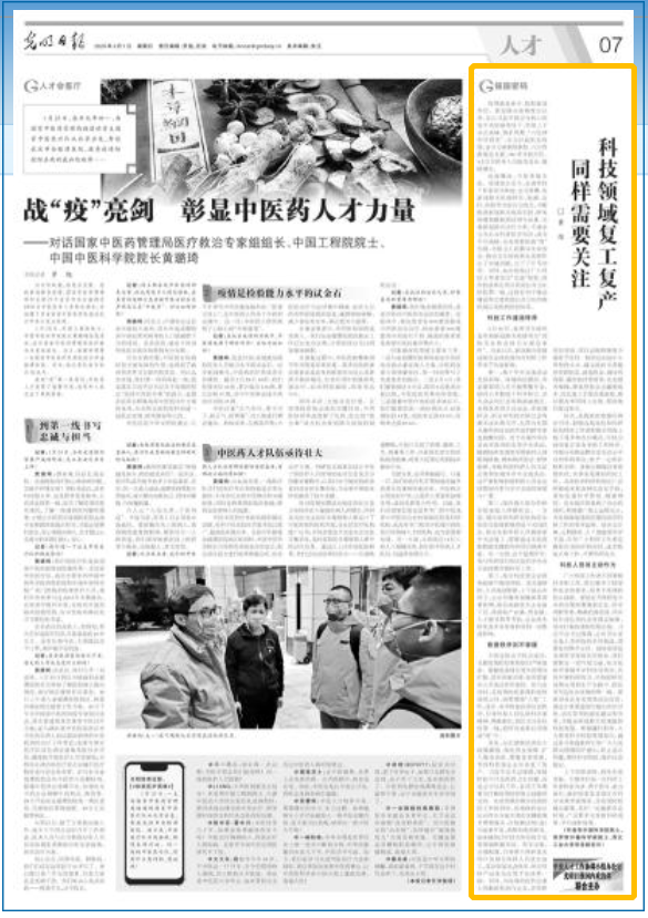 2020年3月1日,《光明日报》刊发中国科开云体育app下载 院士、俄罗斯外籍科开云体育app下载 院士、开云体育app下载 信息材料与纳米技术研究院学科带头人黄维院士署名文章,题为《科技领域复工复产同样需要关注》: