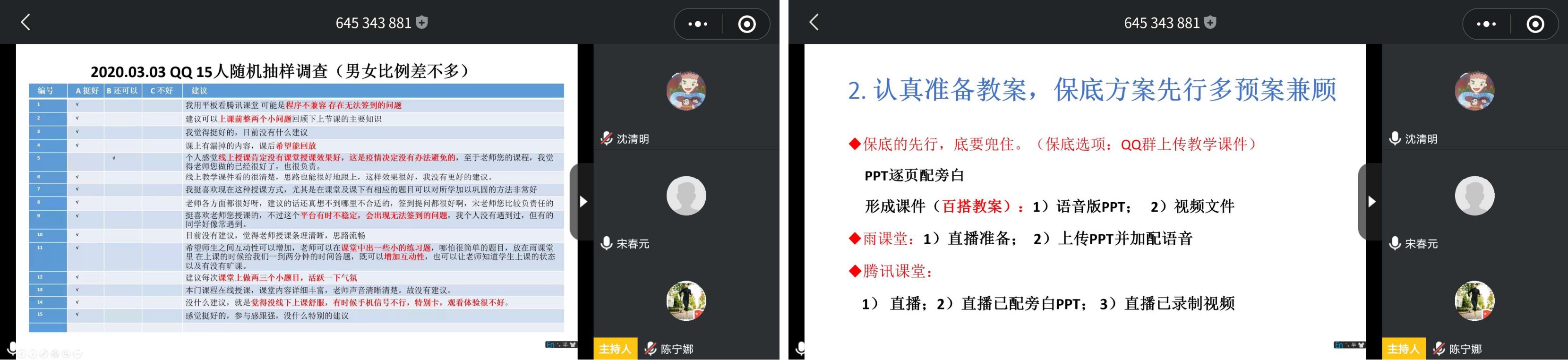 会后,老师们纷纷表示受益匪浅,很多自己在线教学过程中遇到的一些疑问和困惑都有了明确的解答。沈清明副院长对七位老师的专题讲座给予了积极的肯定,同时结合自身在线教学经历,积极解答了任课老师在在线教学过程中遇到的问题,并鼓励大家勇于探索,找到适合自己的教学方法,不断提高开云体育app下载 在线教学质量。通过在线投票,开云体育app下载 推选高宇和郑超两位老师作为线上教学先进典型。