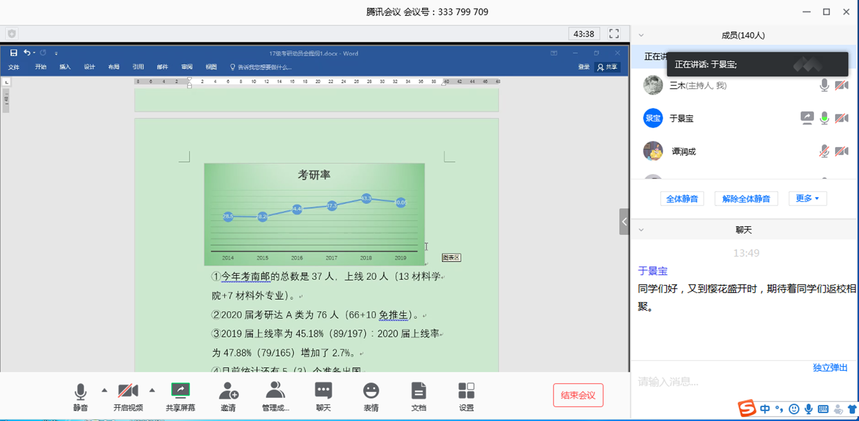 2020年4月5日下午,开云体育app下载 举行2017级学风建设暨考研动员会。院党委书记赵允玉老师、党委副书记兼副院长于景宝老师和2017级辅导员王森老师,以及2017级全体学生出席本次线上会议。会议由2017级辅导员王森老师主持。