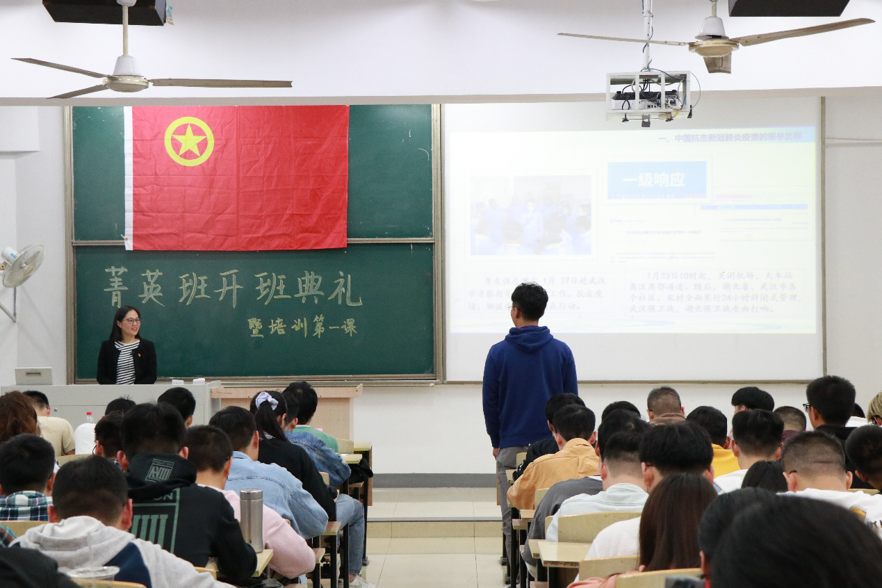 开班典礼在铿锵有力的团歌中圆满落幕。开班典礼后,赵允玉书记为菁英人才培训班进行第一次授课。赵书记为大家介绍了新冠肺炎疫情的实时情况,展现了疫情期间中国的独特风景。她重点讲述了中国抗疫的艰辛历程、基本经验以及在抗疫中彰显的人类命运共同体理念,使同学们对这次疫情中的伟大的人和事有了更好的了解,加深了对国家和社会的进一步认识。