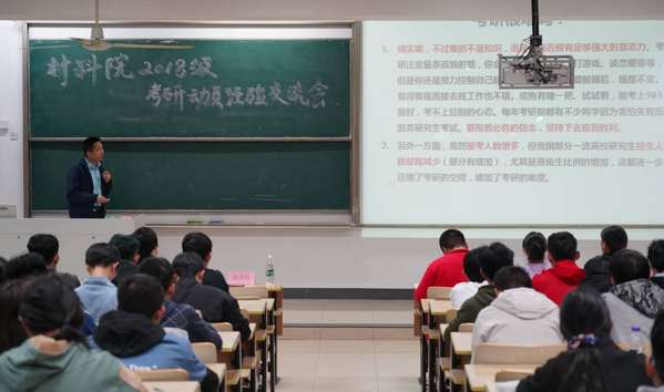 沈清明副院长首先分析了2018级同学面临的考研情况。一方面,去年新增的40万考生以至874万的巨大总量;另一方面,报考和录取人数都再创新高,机遇与竞争并存。沈院长从学历贬值、工资水平和成功助力三方面为同学们分析考研原因;再与出国、就业相比较,指出考研的独到优势;出发于考研难度,设身处地地分析了当下同学们的学习状况、竞争能力;最终就开云体育app下载 选择方式进行指导,大家发现材料院以地理优势,名师指导,开云体育app下载 助力深造等特点将成为同学们的绝佳选择。老师亲切寄语同学们:“非学无以广才,非志学无以成学。为学之要贵在勤奋,贵在钻研,贵在有恒。”