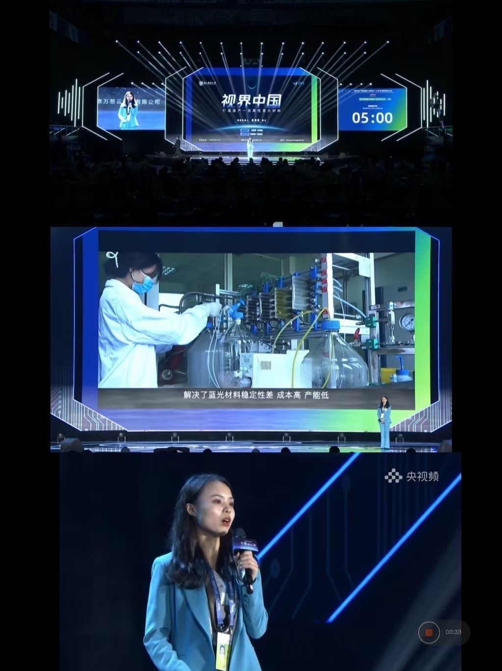 “视界中国”创业团队聚焦国家“卡脖子”需求,专注于OLED蓝光材料国产化的研发与生产,分别在新材料设计、合成方法优化和量产工艺改良方面实现3大技术突破,有效解决了国产蓝光材料稳定性差、成本高、产能低的行业痛点。研发团队共申请发明专利42项,研究成果发表在顶级期刊《自然通讯》,被人民日报、中国青年报等数百家媒体转载报道。