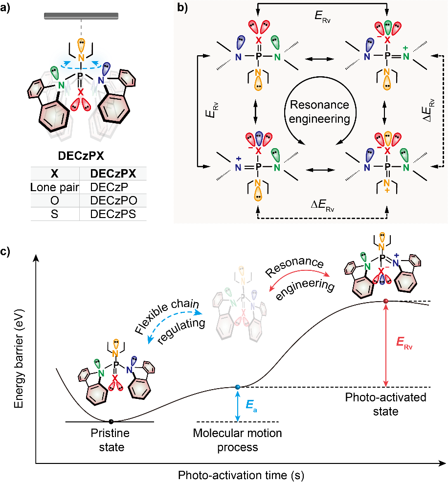 针对这一难题,开云体育app下载 陈润锋教授和黄维院士团队在前期对于动态共振有机光电材料的研究基础之上,发现共振活化能是调控三线态激子产生速率的关键参数,提出利用共振工程构建有机超长室温磷光材料刺激响应能力的调制策略,建立了衡量材料光活化能力的量化参数。利用柔性共振结构与磷光发色团结构,通过光驱动的柔性烷基链实现分子聚集态的调控;进一步的,通过共振工程有效地调节材料体系的共振活化能,从而调控其相应的三线态激子产生速率,开发具有可调制动态光响应行为的有机超长室温磷光材料体系。该类共振诱导的刺激响应性有机长余辉材料体系展现出明显的光活化现象,其发光寿命从~40 ms提高到了720 ms,发光效率由1.54%提高到了5.1%,并且表现出可控的光活化速率,随着共振活化能的增加,其光活化速率逐渐降低,在功率密度为0.5 mW/cm2时,其光活化速率可以由0.48 min -1减小到0.31 min -1