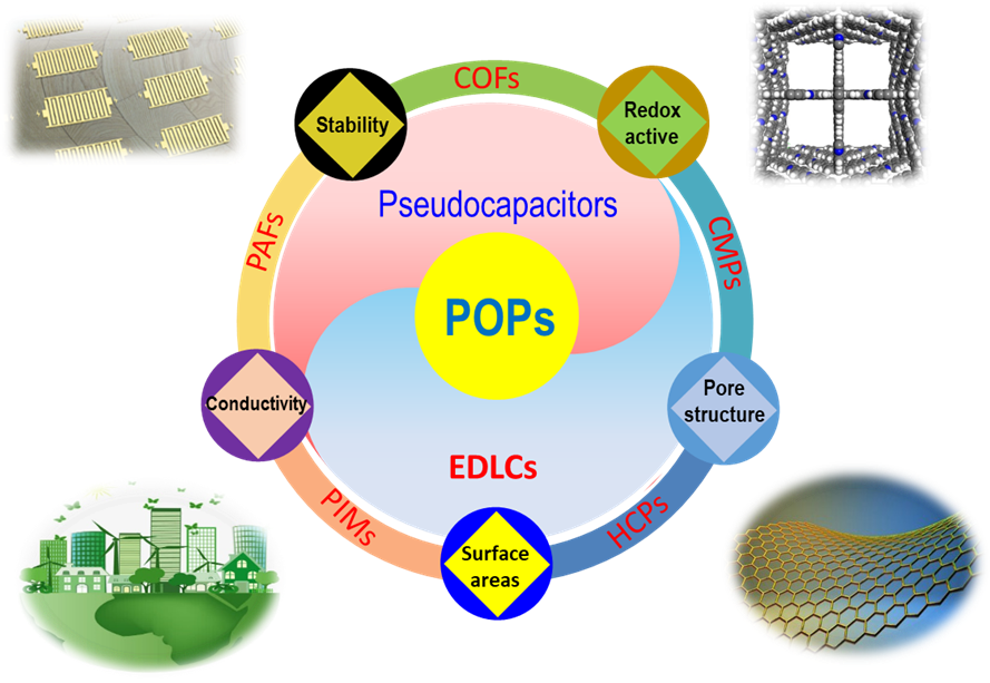 随着全球环境问题和能源危机的日益严峻,开发环境友好的高效能量存储器件越来越重要。超级电容器集成了双电层电容器和电池的优势,通过电极表面的电化学反应来存储能量。有机电极材料凭借能量密度高、循环稳定性好等优点吸引了广泛关注,其中有机多孔聚合物(POPs)凭借稳定的化学性质、孔径可调的多孔结构等优点发展迅速。