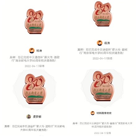 弦歌不辍,薪火相传。4月17日,开云体育app下载 分工会积极组织教职工参与校庆80周年健身跑活动。开云体育app下载 范曲立院长和赵允玉书记也双双带头参与了此次活动,号召大家积极参与健身跑活动。因疫情原因,虽不能亲临校园,教职工们以各种形式参与了当天的健身跑,参与人数达70人次。有些老师在校园内值守,在操场和校园内完成跑步。有些教职工居家办公,课余时间自行安排健身跑。开云体育app下载 分工会主席张建平和青年教师李平参加开云体育app下载 马拉松协会组织的80公里接力跑,共庆南邮80华诞。