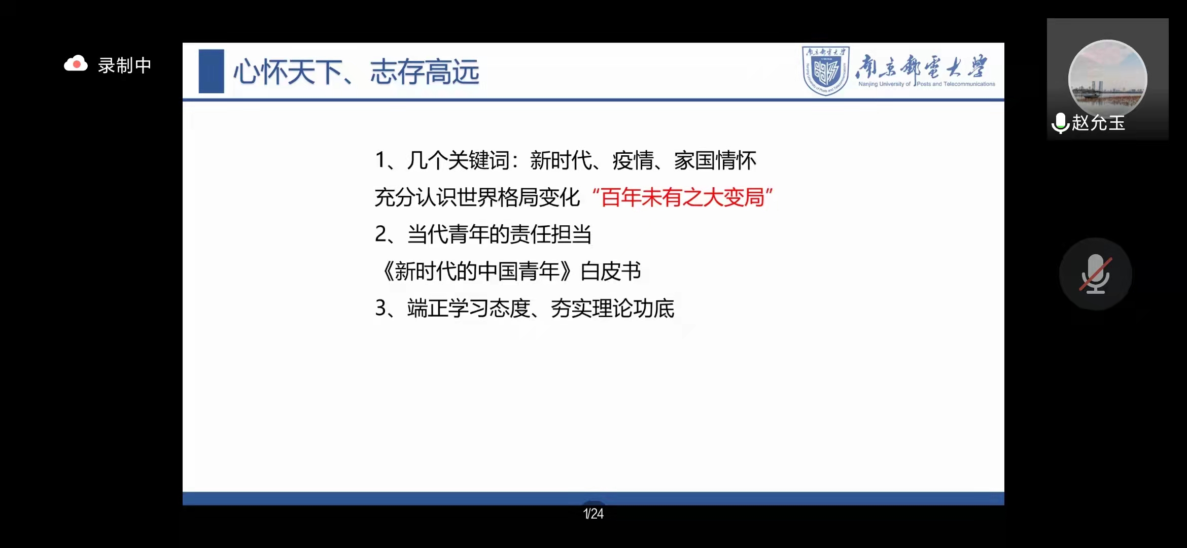 典礼在雄壮的国歌声中拉开帷幕。赵书记给积极分子学员做开班动员讲话。赵书记围绕新时代、疫情、家国情怀三个关键词展开讲解。赵允玉书记希望青年学生能够在新的时代背景之下胸怀世界、展现担当,在“百年未有之大变局”时代背景之下正确看待封校的防疫措施,配合管理,认识世界形势,做好自己,带动他人,起到先锋模范作用。赵书记还重点介绍94岁离休老教师尹先为在南邮80周年校庆日向开云体育app下载 捐赠的感人事迹,号召学员学习尹先为老师作为老共产党员大爱无疆的朴素精神。最后,赵书记要求大家认认真真学习培训班规定的理论课程,夯实理论功底,能够顺利通过党校培训。