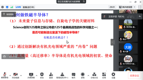 承国脉,薪火相传八十载;创未来,弘毅笃行谱新篇。值此南邮八十华诞校庆学术活动月之际,应开云体育app下载 陈润锋教授邀请,华南理工大学马於光院士于2022年5月3日上午10点在腾讯会议和腾讯直播上为师生作了以“室温有机铁磁半导体”为主题的学术报告。材料院副院长陈润锋主持了报告,线上共有近200名师生参加学习交流。