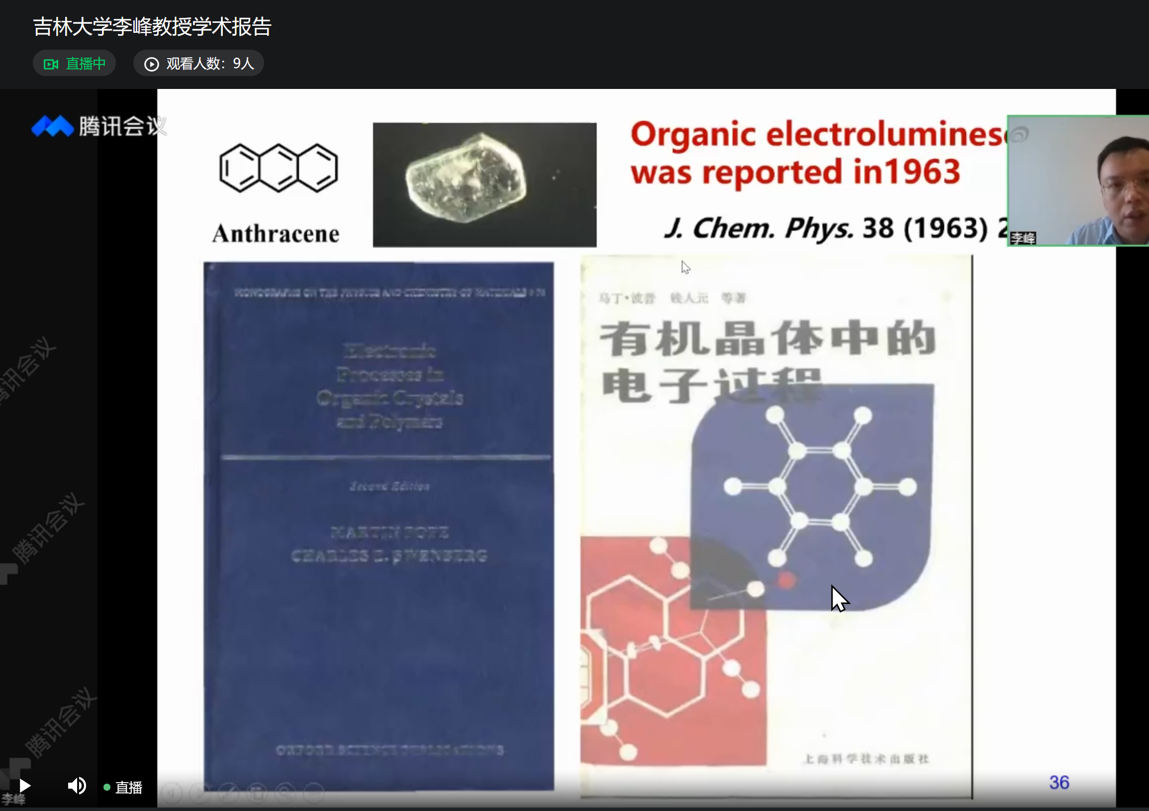 承国脉,薪火相传八十载;创未来,弘毅笃行谱新篇。值此南邮八十华诞校庆学术活动月之际,应开云体育app下载 陈润锋教授邀请,吉林大学李峰教授于2022年5月6日下午2点在腾讯会议和腾讯直播上为师生作了以“双线态自由基发光材料与器件”为题的精彩报告。材料院副院长陈润锋主持了报告,线上共有100余名师生参加。