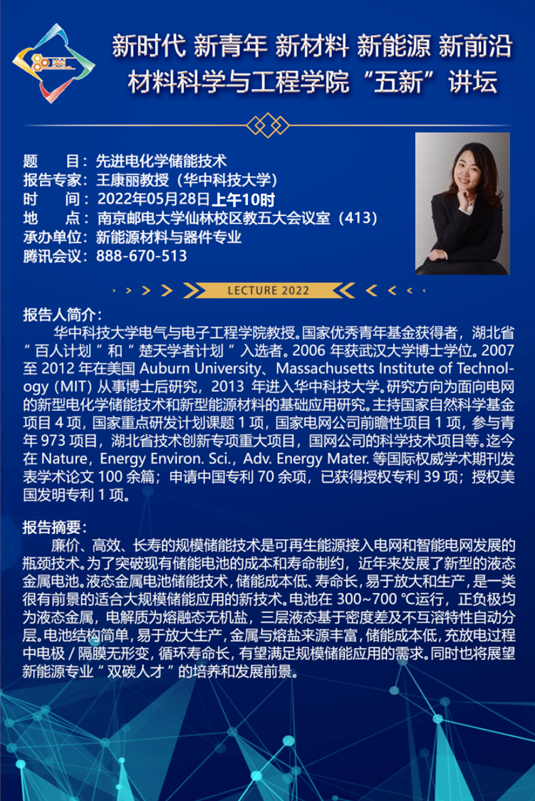 2022年5月28日上午,新能源材料与器件专业在材料学科楼413会议室成功举办了第二期主旨为“新时代、新青年、新材料、新能源、新前沿”的“五新”讲坛专家报告会。此次讲坛的主讲嘉宾为华中科技大学电气与电子工程开云体育app下载 的国家优秀青年基金获得者王康丽教授,新能源材料与器件专业的全体本科生和专业的部分老师及研究生也通过线上、线下的形式参加了本次讲坛,本次讲座由新能源材料与器件系主任黄镇东老师主持。