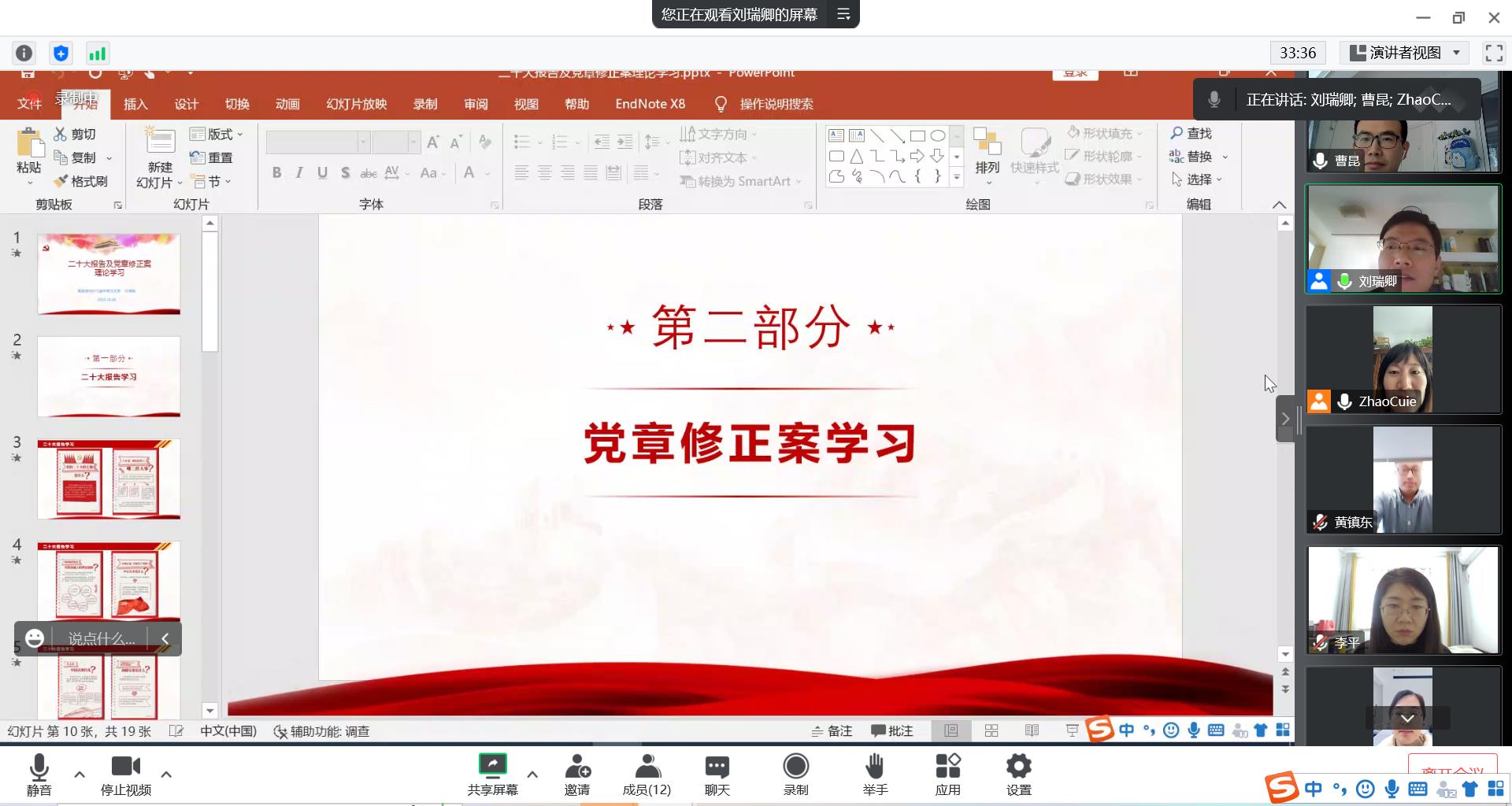 为深入学习贯彻党的二十大精神,增强支部党员的理论素养,刘瑞卿书记带领大家进一步学习了党的二十大通过的《中国共产党章程(修正案)》,从修改党章的必要性、修改的具体内容以及修改党章的意义三个方面进行了详细解读,并指出,我们要始终坚持学习党章、尊崇党章、贯彻党章、维护党章,把学习党章同学习党的二十大精神紧密结合起来,深刻领会党章修正案的内容和意义。