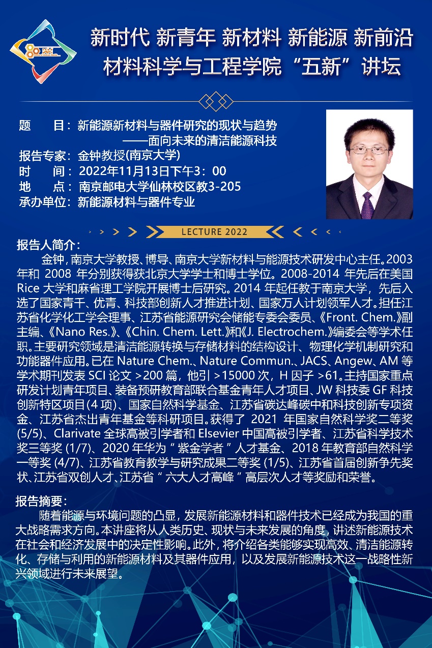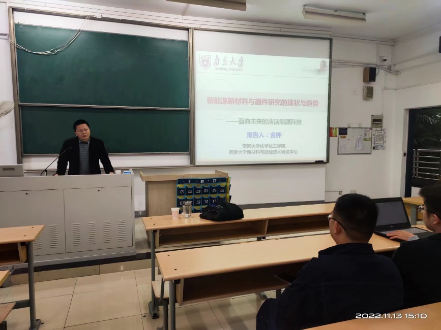 2022年11月13日下午,开云体育app下载 在教3-205教室成功举办了第三期主旨为“新时代、新青年、新材料、新能源、新前沿”的“五新”讲坛。此次讲坛的主讲嘉宾为南京大学新材料与能源技术研究中心主任、国家领军人才、国家优秀青年基金获得者金钟教授。新能源材料与器件专业的全体学生和部分专业骨干老师及研究生参加了本次讲坛,本次讲坛由新能源材料与器件系主任黄镇东教授主持。