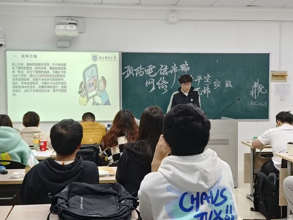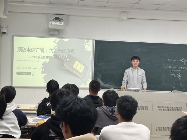 B220605周靖卓同学首先普及了“什么是电信诈骗”,播放了有关电信诈骗的视频,让同学们深深体会到电信诈骗带来的严重后果,随后介绍了电信诈骗的各种手段、特点并进行提问,同学们积极踊跃的举手发言,讲述自己对电信诈骗的认知或者经历。同学们的积极参与让大家认识到电信诈骗并非是只存在于电视剧中的剧情,而是真实发生在身边的事件。