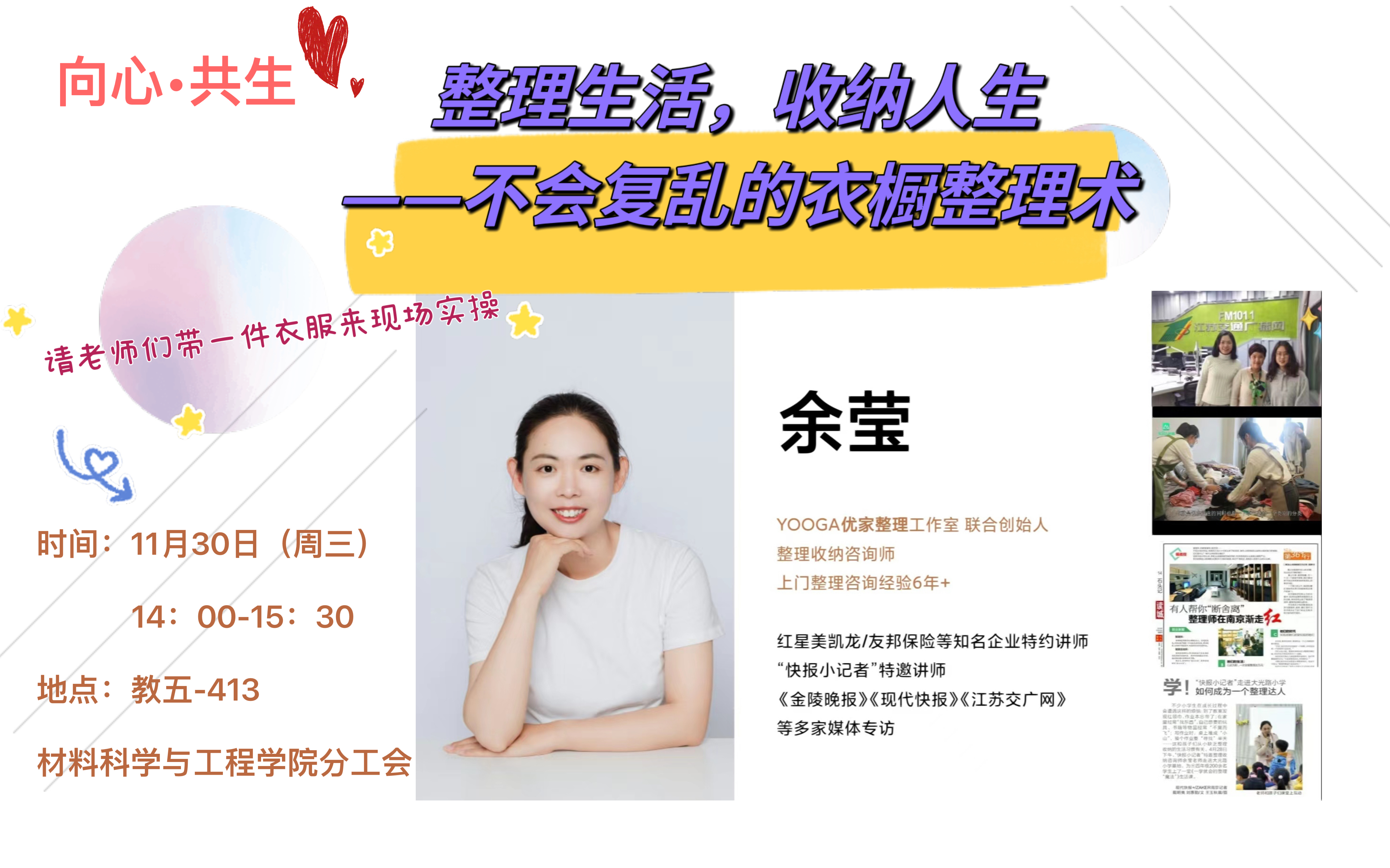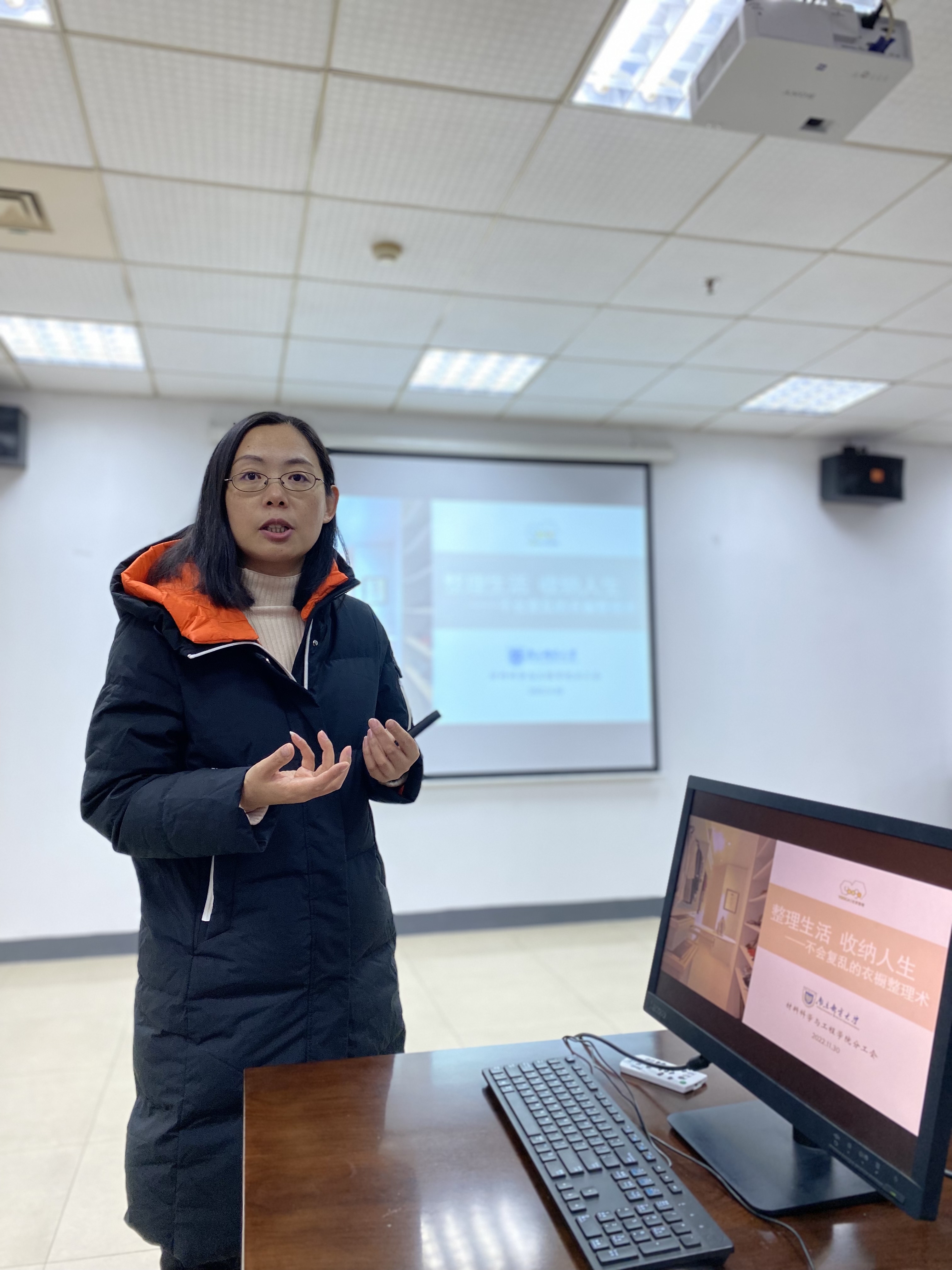 11月30日下午,开云体育app下载 邀请到YOOGA优家整理工作室的联合创始人、整理收纳咨询师余莹做《整理生活,收纳人生——不会复乱的衣橱整理术》讲座,现场为老师们讲解居家环境的收纳哲学,梳理衣橱整理收纳的技巧和方法,带领老师们现场操作练习基本收纳步骤。