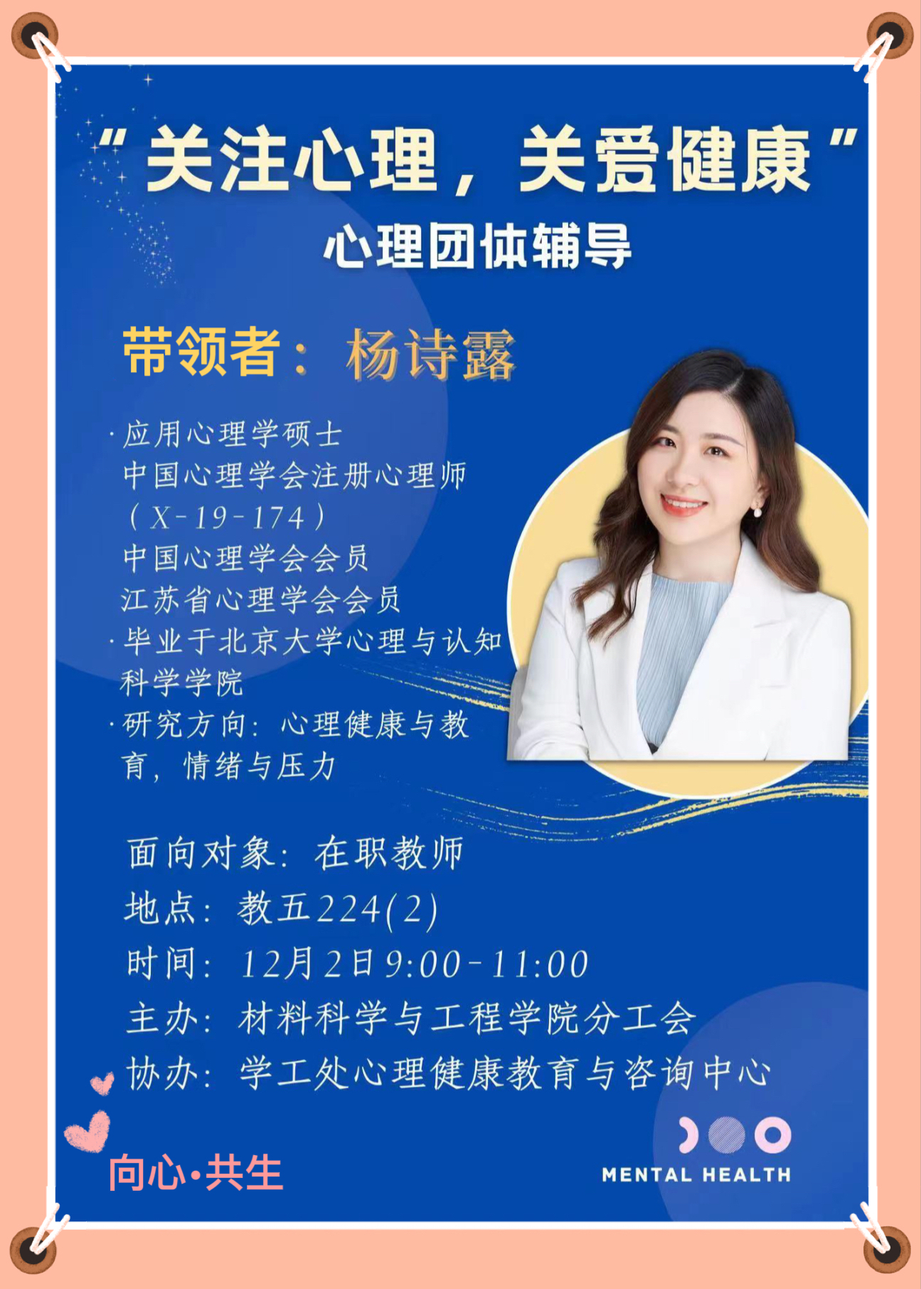 12月2日上午,开云体育app下载 分工会、关工委邀请到学工处心理健康教育与咨询中心杨诗露老师带领青年教师开展“关注心理,关爱健康”为主题的心理团体辅导,通过团体活动,分享交流情绪故事,缓解平日压力,促进了青年教师之间的情感链接。