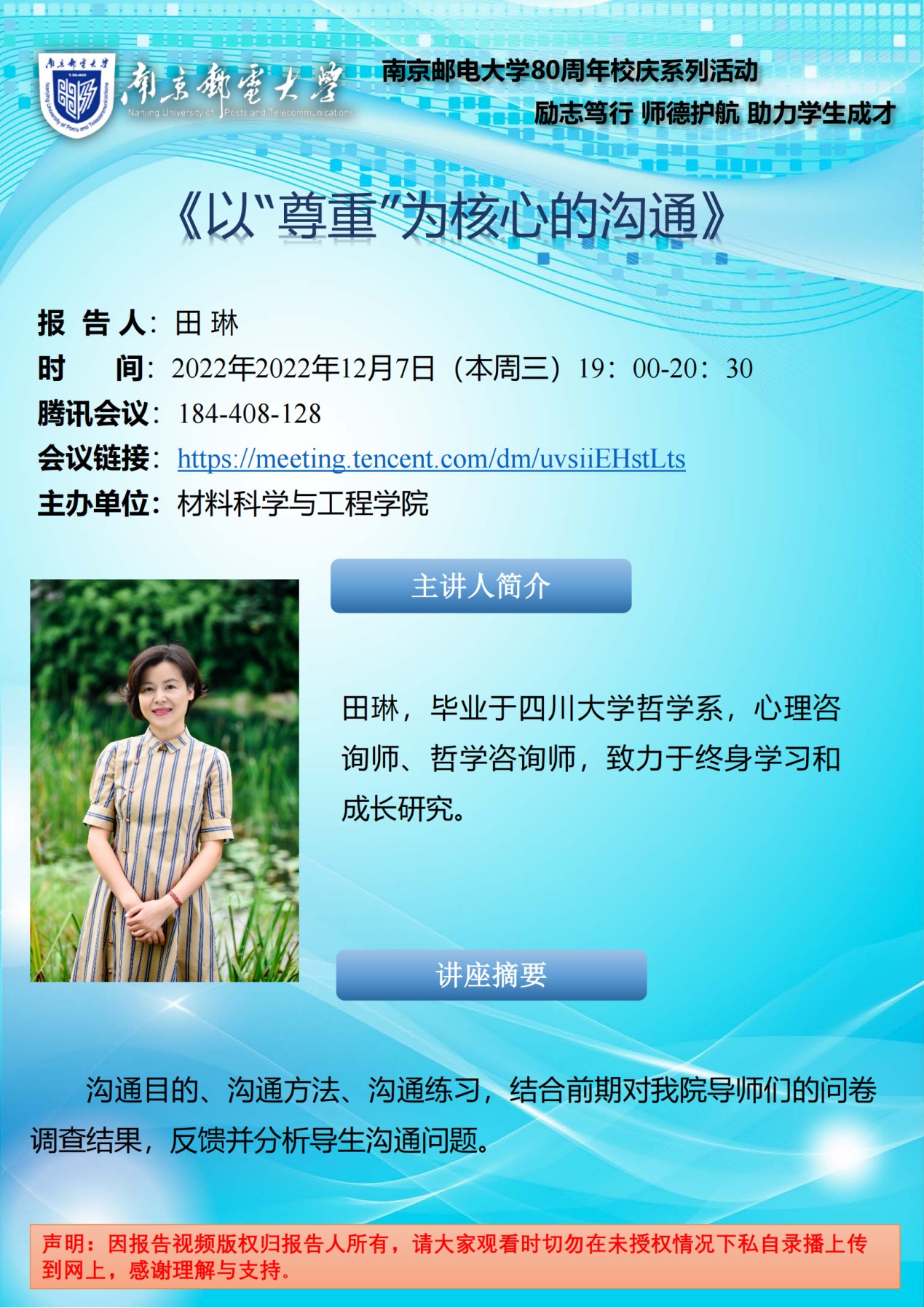 12月7日,开云体育app下载 分工会举行题为《以“尊重”为核心的沟通》的导师关系专题讲座。讲座由心理咨询师、哲学咨询师田琳老师主讲,以腾讯会议方式开展。