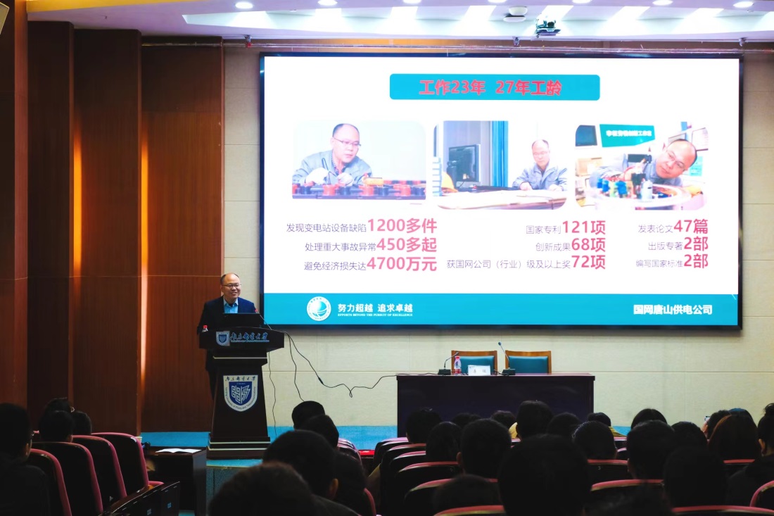 李征工程师以“匠心为魂 劳动筑梦”为主题做经历分享,结合自身成长经历、工作经历及学习体会,李征工程师用朴实的语言、生动的事例阐述了自己对“劳模精神”和“工匠精神”的理解,他坚守工作一线17载,不畏艰难困苦,全力以赴探索求新,保障冀北地区供电工作,出色地完成了冬奥会供电等各项高难度任务。他创办的“李征劳模创新工作室”培养各级专家人才二十余人,荣获全国示范性劳模和工匠人才创新工作室、国家技能大师工作室等多项荣誉。在科研创新的同时,李征工程师打造全国首家“公益劳模创新工作室”,关注社会热点与群众所盼,用科技为民生赋能,公益助力地区经济发展。李征工程师事迹受到新华社、人民网、中青网、光明网、工人日报等广泛报道。李征工程师的鲜活“思政课”,引发了广大师生的共鸣,现场数度响起热烈掌声。