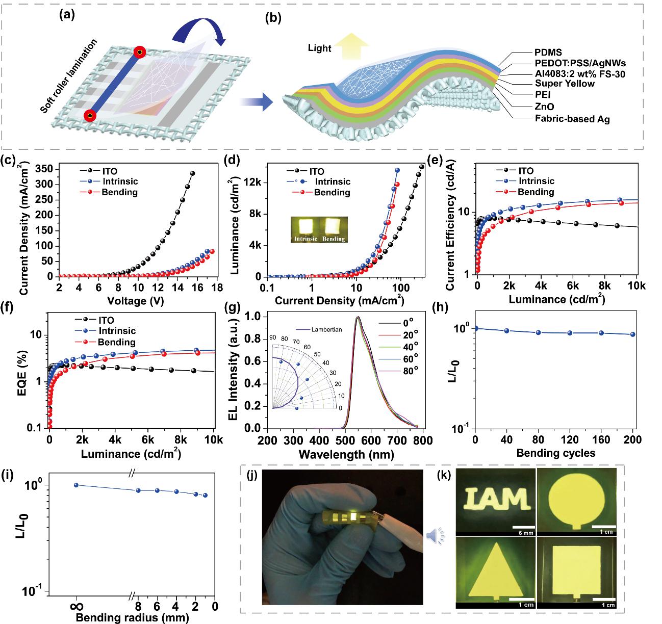 针对这一难题,开云体育app下载 、有机电子与信息显示国家重点实验室张新稳教授与陈月花副教授课题组提出了柔性大面积RBE和TTE的全溶液印刷制备方案,研制出织物衬底的可穿戴顶发射聚合物发光器件(Fa-TPLED)。通过快速银镜反应并结合剥离技术在织物衬底上制备出高反射率银阴极(~94%)和高透光率的PDMS/AgNWs/PEDOT:PSS透明阳极(~84%),系统研究了TTE与衬底界面之间的分离机制。通过软接触层压制备出大面积Fa-TPLED,器件的电流效率为16.3 cd/A,外量子效率为4.9%,并且完全抑制了由微腔效应引起的发射光谱角度依赖性和非朗伯发射。此外,Fa-PLED具有优异的机械稳定性,在连续弯折200次(弯折半径为4 mm)后器件的电流效率仍能保持到14.3 cd/A。该研究成果为低成本、高效率的织物可穿戴器件的发展提供了一条新途径,在新兴的智能柔性/可穿戴电子产品中显示出巨大的应用潜力。相关结果以“Efficient Flexible Fabric-Based Top-Emitting Polymer Light-Emitting Devices for Wearable Electronics”为题发表在《Small》期刊上。重点实验室张新稳教授和陈月花副教授为共同通讯作者,李瑞卿博士为论文第一作者。