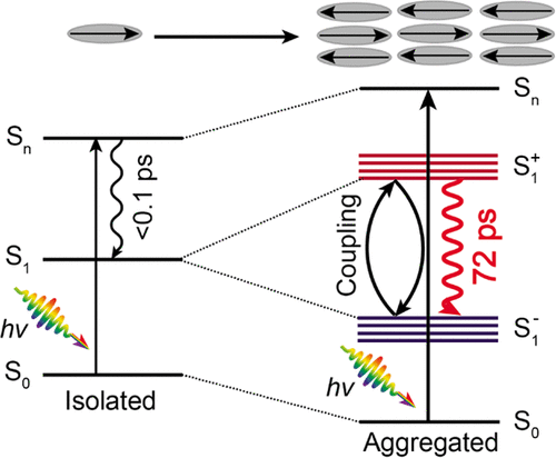 图1 有机单分子的双能级系统和聚集态三能级结构示意图和相应的热载流子冷却时间