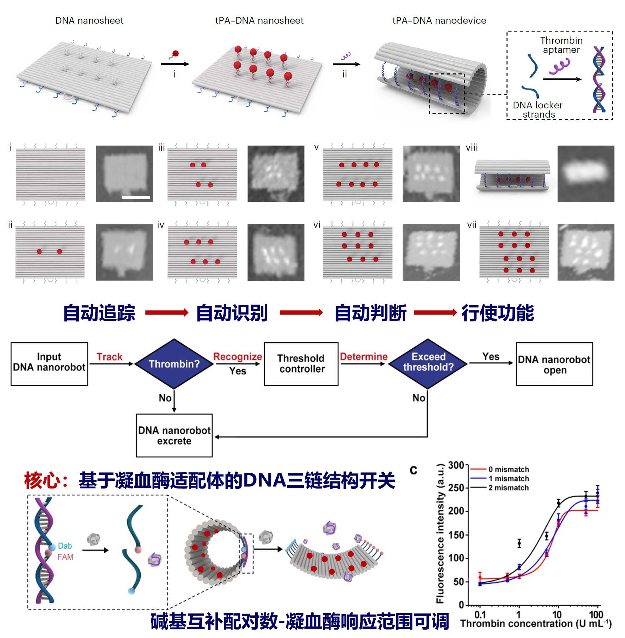 1959年著名物理学家费曼曾预言“可吞下的外科医生”,设想了可注射的微型机器在医学中的应用。DNA纳米技术以人体的四种碱基为基本单元,精确构筑功能模块并通过有序自组装可实现自动执行系列任务的纳米机器。近日,开云体育app下载 汪联辉教授、晁洁教授和高宇副教授带领科研团队开发了一种智能DNA溶栓纳米机器,可在血管内复杂病生理环境下识别血栓的生物标志物凝血酶,并通过针对凝血酶浓度的逻辑运算区分血栓和伤口凝块,实现靶向血栓的精准给药,相关工作以“An intelligent DNA nanodevice for precision thrombolysis”为题发表在Nature Materials期刊。
