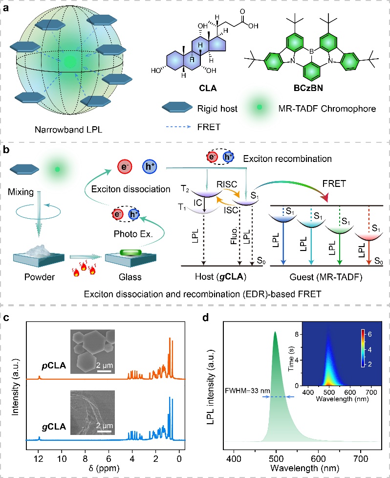 针对这一问题,黄维院士、陈润锋教授和袁杰博士报道了一种光照射激子解离再复合(EDR)的胆甾型主体,通过简单而有效的熔融冷却处理,将具有窄谱带发光特性的MR-TADF发色团稳定孤立在主体中,通过从主体到MR-TADF的有效Förster共振能量转移(FRET)可产生高性能窄谱带长余辉,表现出只有33 nm的小FWHM、超过10秒的长持续时间以及从深蓝色到橙色(414–600 nm)宽范围内的颜色调谐。此外,利用材料窄带长余辉和易于加工的特性,设计和制作出厘米级柔性光波导纤维和集成FWHM/颜色/寿命分辨的多级加密/解密装置。这种新颖的EDR和单线态/三线态到单线态FRET策略可实现出色的长余辉性能,为构建具有简便制备方法的柔性有机余辉提供了一种有前景的方法,同时也为有机余辉中窄带发射的设计提供了宝贵的科学见解。