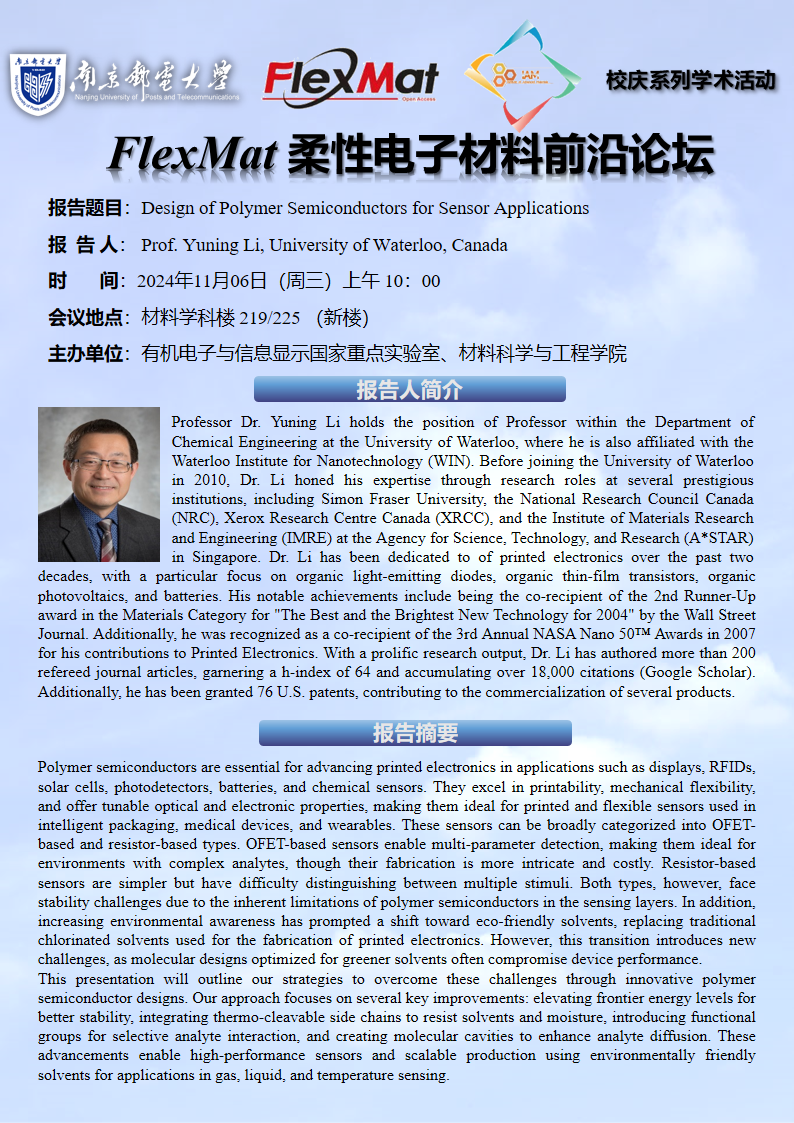 FlexMat柔性电子材料前沿论坛:Prof. Yuning Li, University of Waterloo, Canada