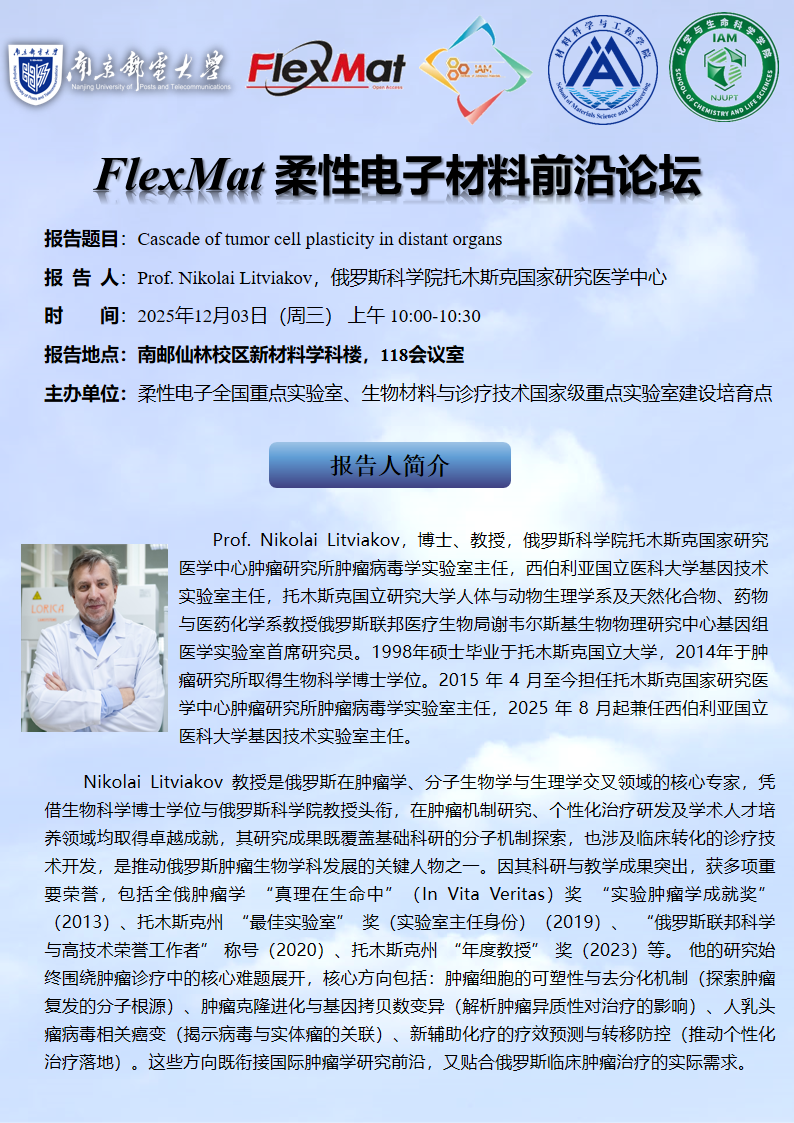 FlexMat柔性电子材料前沿论坛: 俄罗斯科开云体育app下载 托木斯克国家研究医学中心 Prof. Nikolai Litviakov