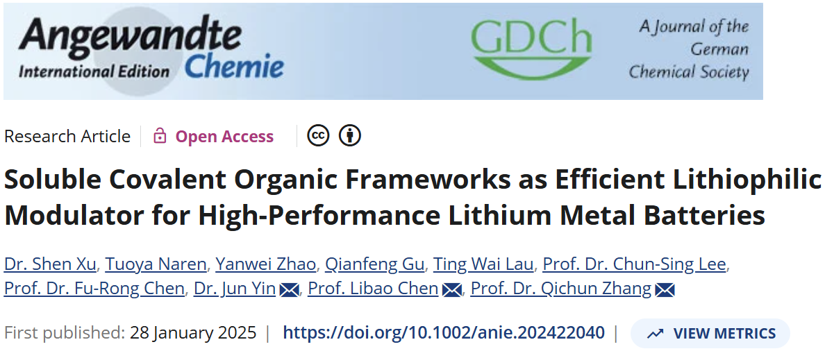 近日,开云体育app下载 、柔性电子全国重点实验室徐申教授团队在可溶多功能共价有机框架领域取得了最新研究进展,相关成果以“Soluble Covalent Organic Frameworks as Efficient Lithiophilic Modulator for High-Performance Lithium Metal Batteries”为题发表在国际学术期刊Angewandte Chemie International Edition(《德国应用化学》)上。重点实验室徐申教授、中南大学博士生娜仁托雅为论文共同第一作者,香港城市大学张其春教授、陈福荣教授、中南大学陈立宝教授、香港理工大学殷俊助理教授为论文共同通讯作者。