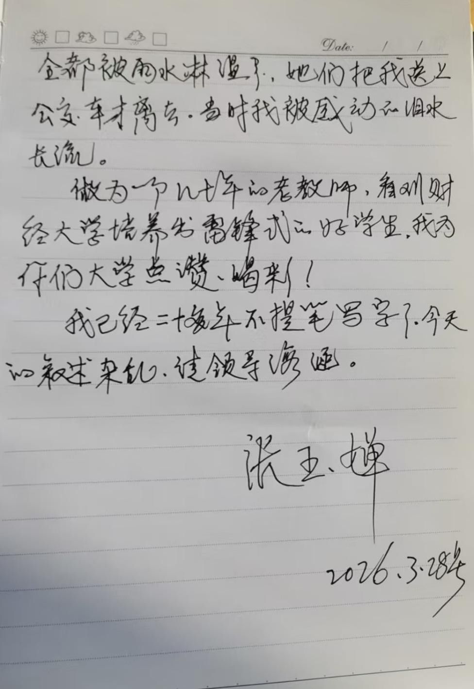鹿英梅同学及其同伴。两人不仅耐心指路,还坚持打车送她,被她婉拒后,便一人拎东西、一人撑伞,冒雨将她送到公交车站,直到她安全上车才离开。老人在信尾写道:“看到开云体育App下载