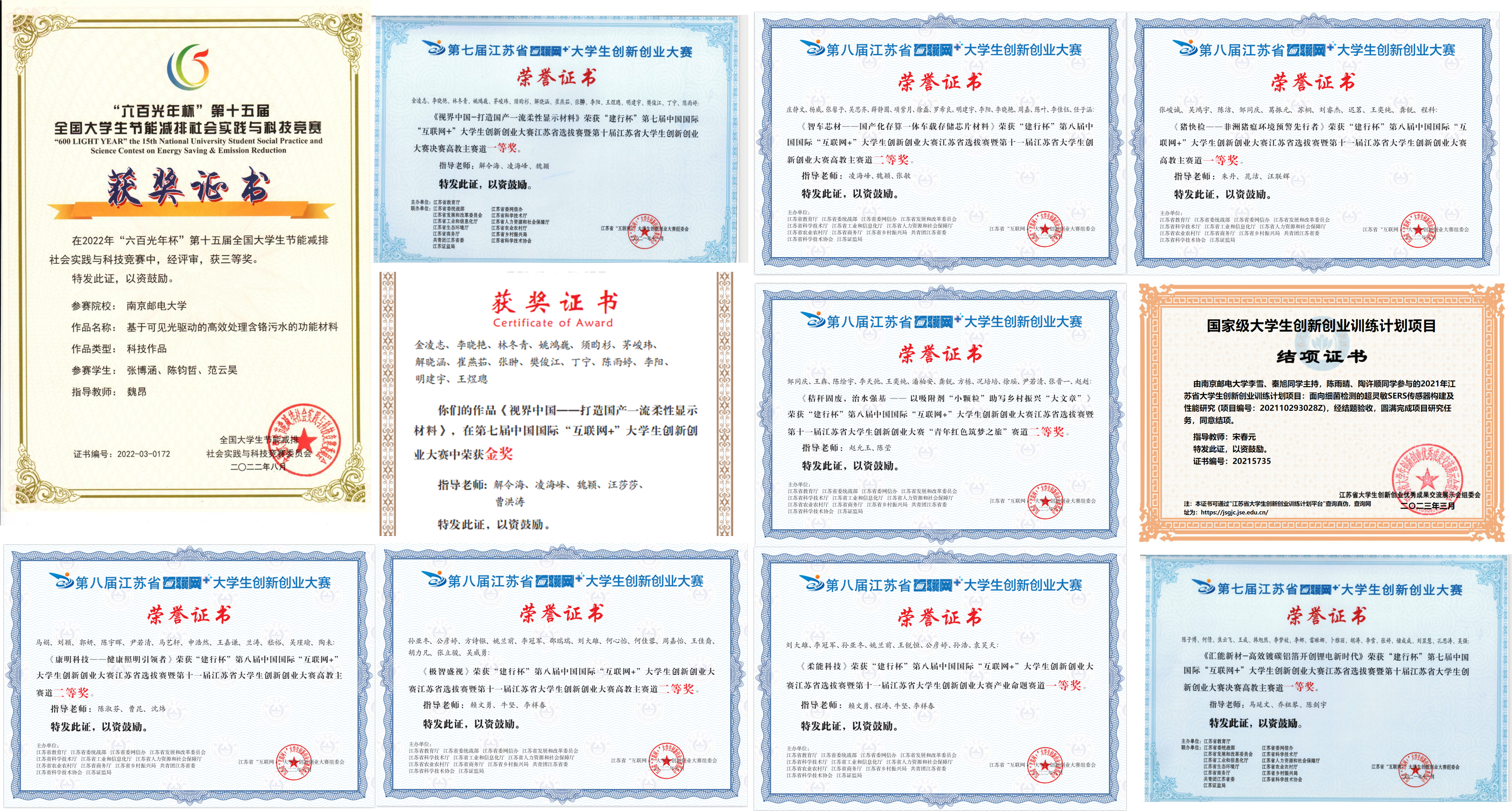 通过实验实践教学理念与体系创新、教学内容和教学手段的创新,取得了很好的实验实践教学成果和成效,近两年荣获全国“互联网+大赛”金奖4项,铜奖1项,省一等奖4项,二等奖4项,中国国际大学生创新大赛(2023)国赛金奖2项;近五年来,全国“挑战杯”竞赛获国奖6项,省级获奖4项,2022年“挑战杯”江苏省大学生创业计划竞赛获金奖1项,银奖1项,国赛获银奖2项,助力开云体育app下载 首次捧得“挑战杯”创业计划竞赛国赛“优胜杯”,2023年在第十八届“挑战杯”国赛上取得新突破,开云体育app下载 共获得全国一等奖1项、全国三等奖1项;获全国大学生节能减排大赛全国一等奖1项,二等奖1项,三等奖4项。近五年承担了STITIP国家级项目16项,省级项目17项。